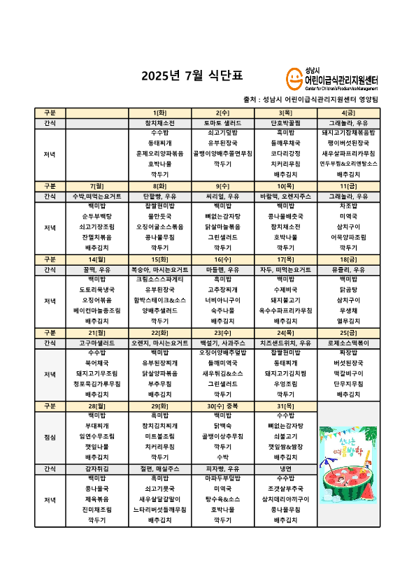 2025년 7월 급.간식표 페이지 정보 작성자 다함께돌봄센터 댓글 0건 조회 142회 작성일 25-06-30 20:21 URL복사 목록 본문 2025년 7월 급.간식표 입니다. 이전글7월 부모교육자료) 여름철 물놀이, 이것만은 꼭! 주의해주세요 25.07.11 다음글문도진 사회복무요원, 시장상 수상 소식 전해드립니다^^ 25.06.25 댓글 0 댓글목록 등록된 댓글이 없습니다.