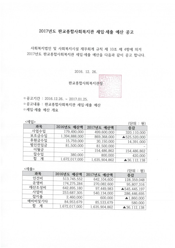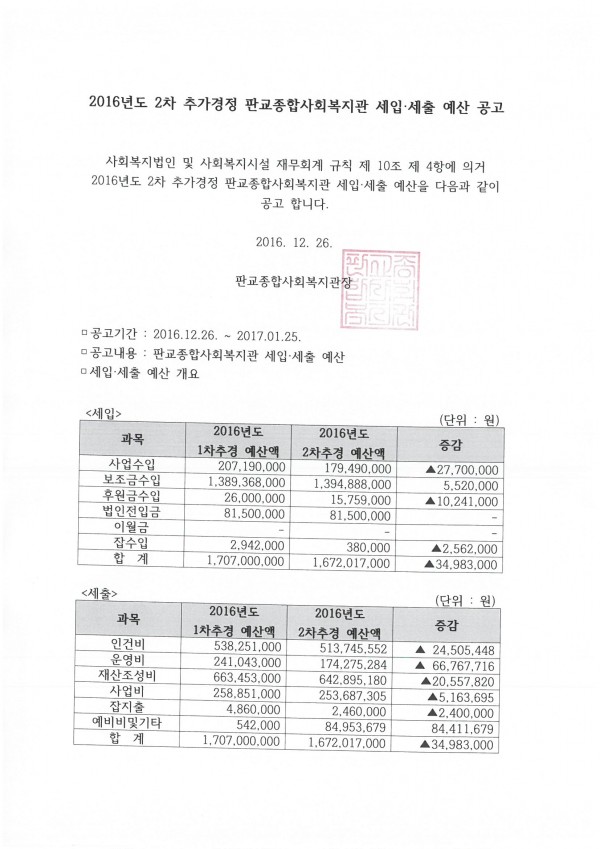 2016년도 2차 추가경정 예산 및 2017년도 세입세출 예산 공고 페이지 정보 작성자 관리자 댓글 0건 조회 6,703회 작성일 16-12-26 00:00 URL복사 목록 본문 댓글 0 댓글목록 등록된 댓글이 없습니다.